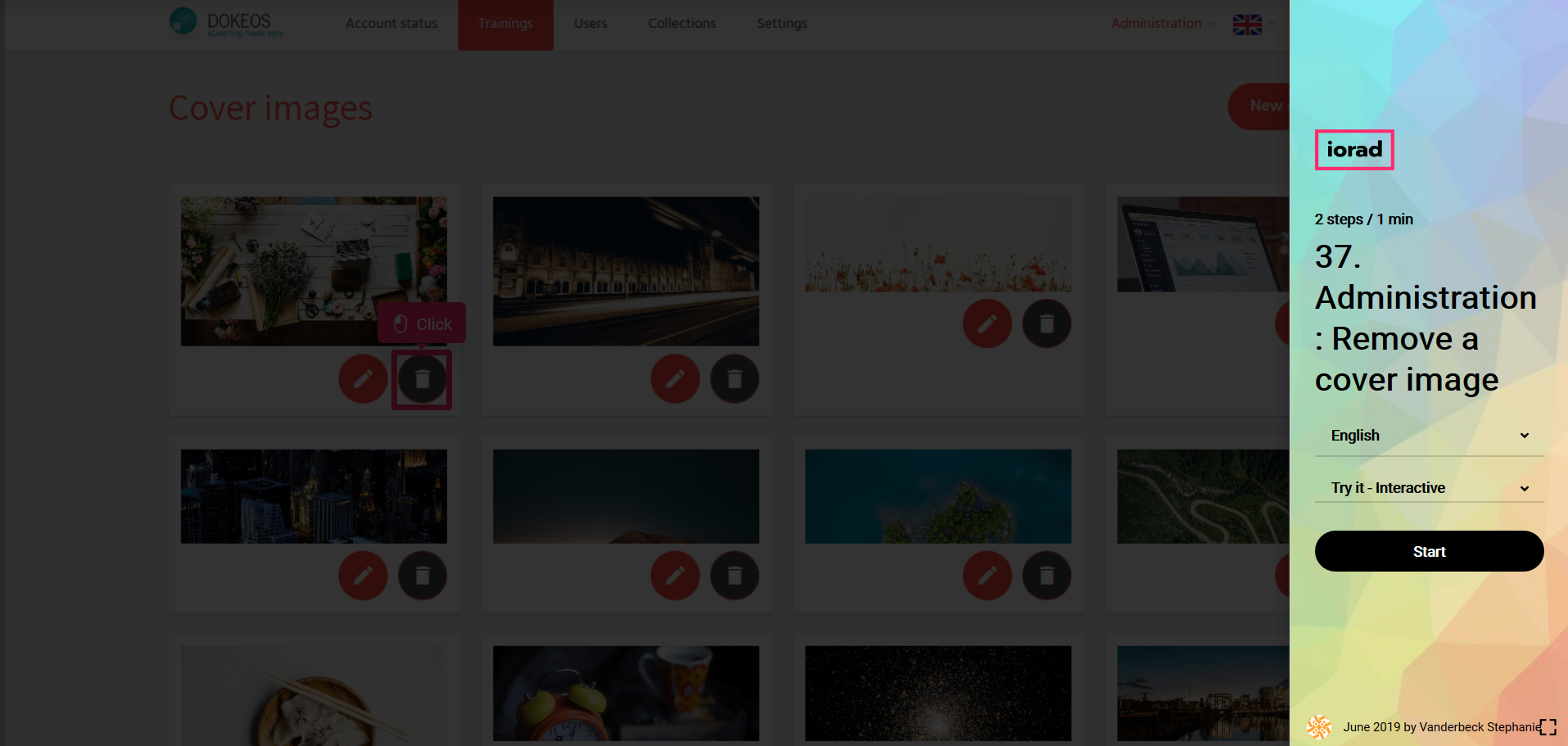 In the tutorial below you will learn to remove a cover image in the administration with Dokeos LMS (creator of e-learning solutions who helps companies, training operators, and multinationals with their online training projects)