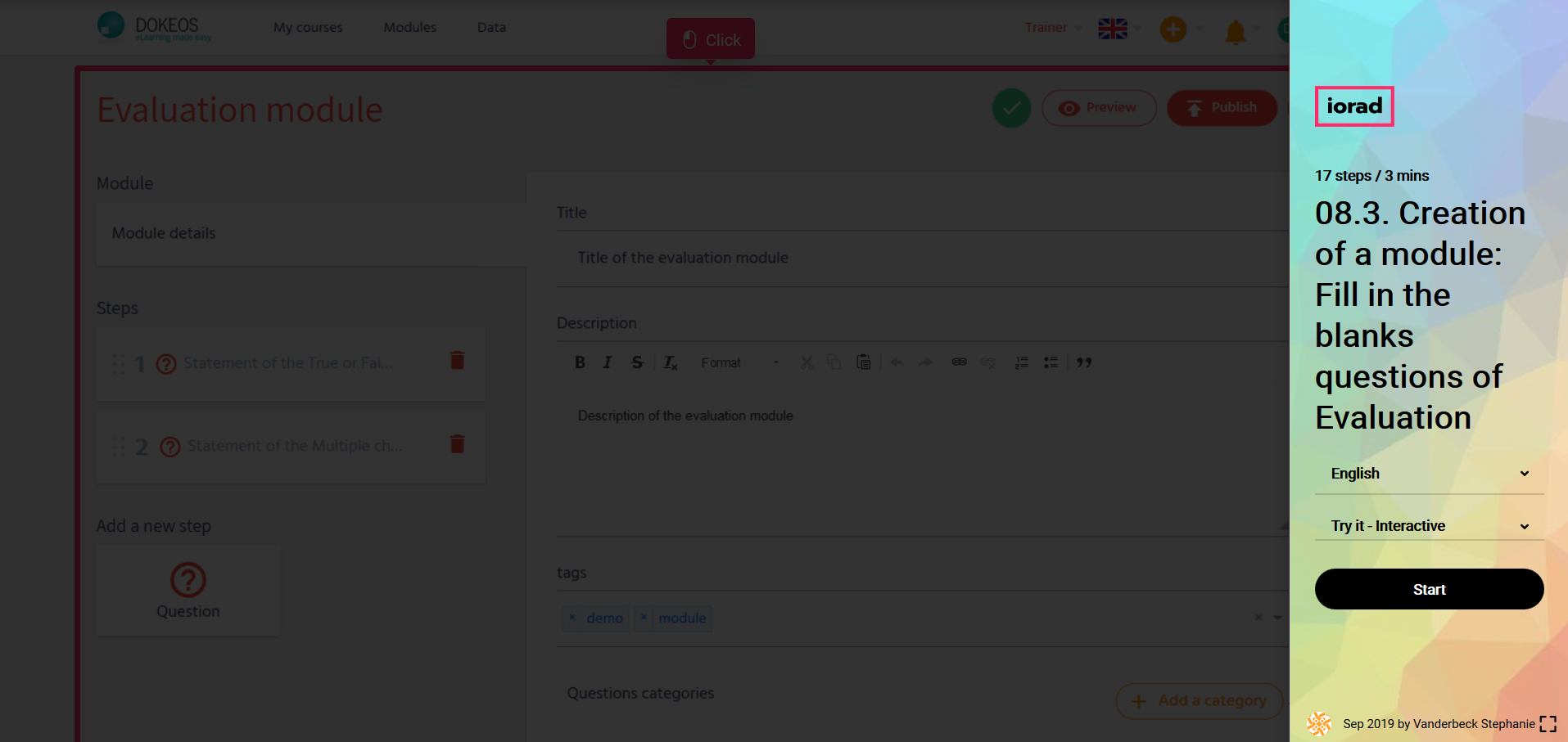 In the tutorial below you will learn to create Fill in the blanks questions in your evaluation module with Dokeos LMS (creator of e-learning solutions that supports companies, training providers and multinationals in their online training projects)