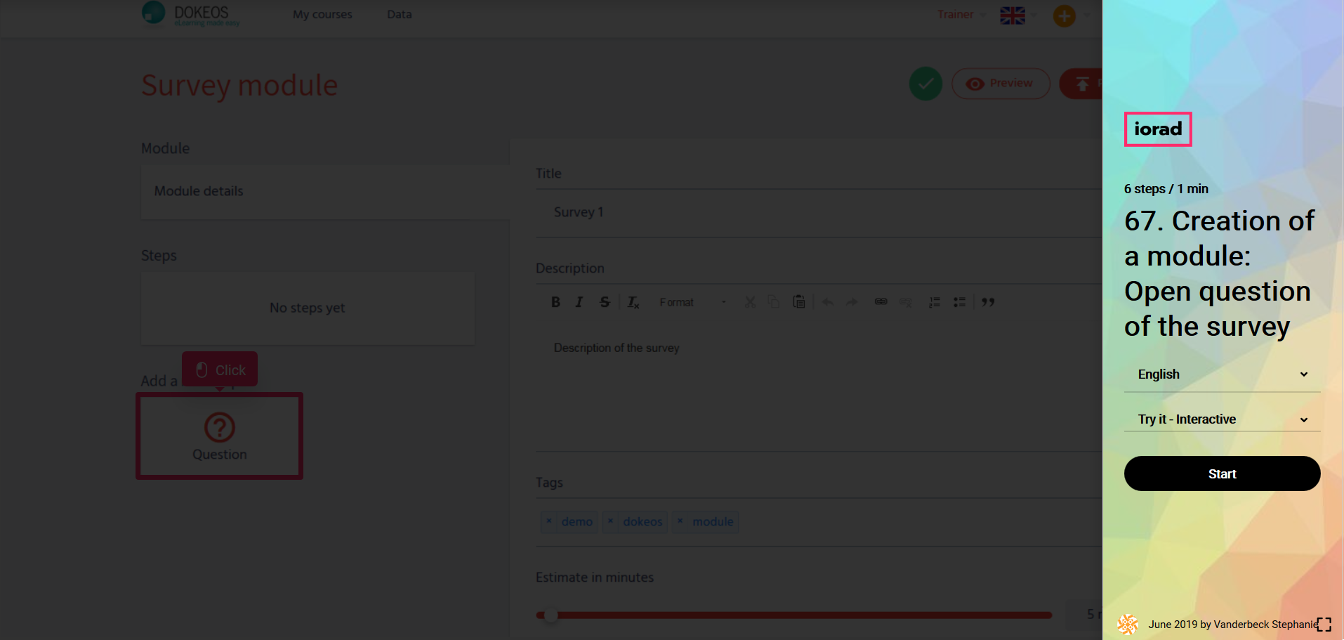 In the tutorial below you will learn to create open questions in your survey module with Dokeos LMS (creator of e-learning solutions that supports companies, training providers and multinationals in their online training projects)