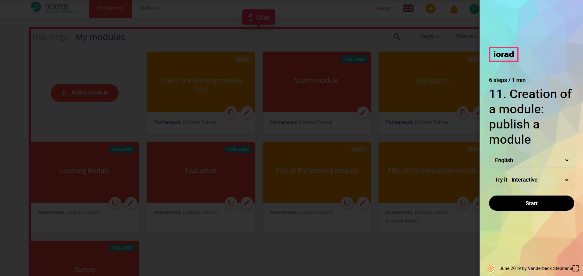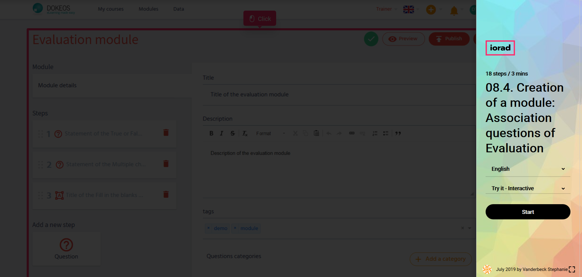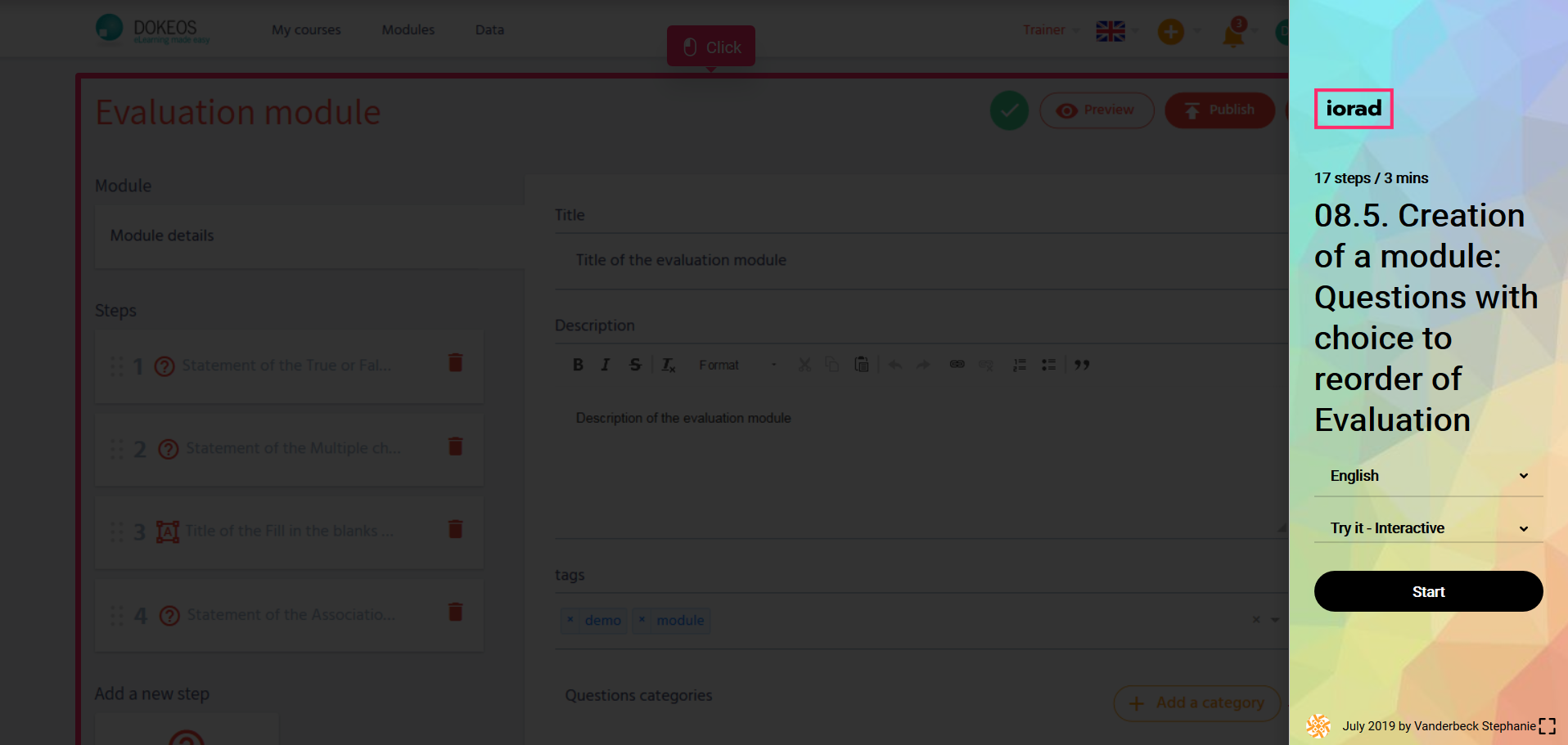 In the tutorials below you will learn how to create an evaluation module from A to Z with Dokeos LMS (creator of e-learning solutions who helps companies, training operators, and multinationals with their online training projects)