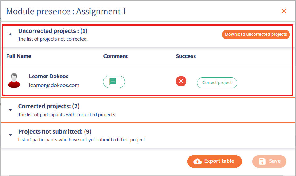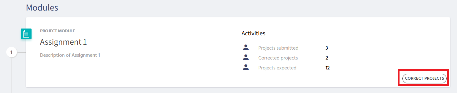 When a learner has submitted a project within a course, you can correct it by going to the course and click on "Correct projects" at the bottom right of the module: