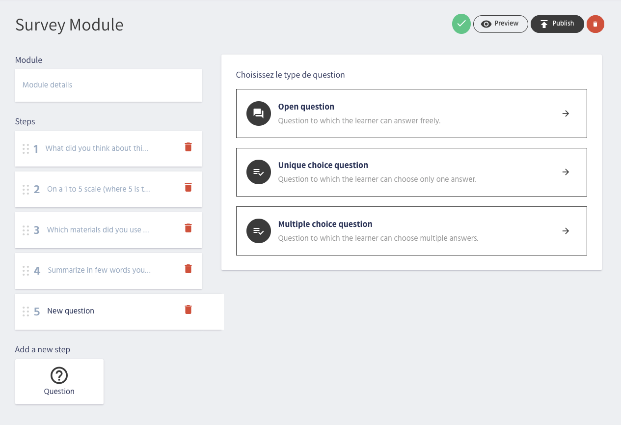 In a Survey module, you can ask your learners questions in different ways to collect feedback on your courses. You can ask open-ended questions and single-choice questions. You can now add multiple choice questions to your surveys as well.